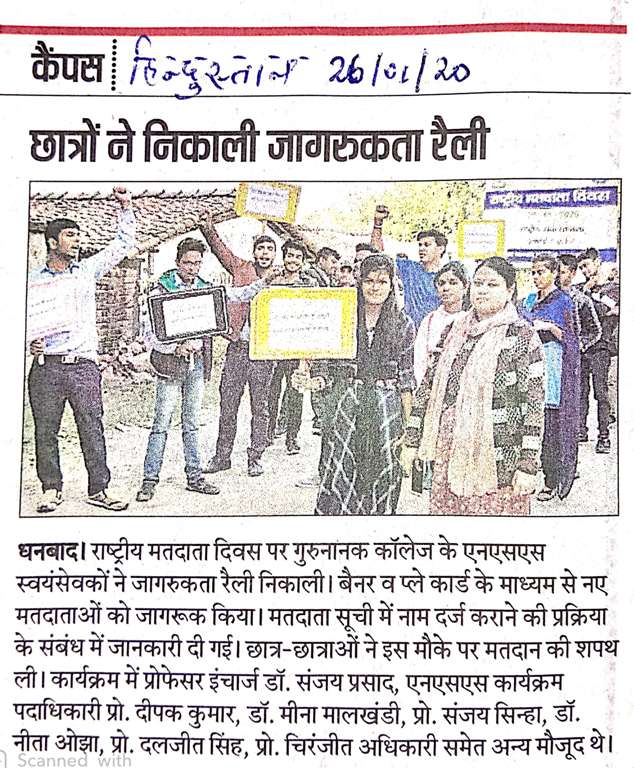 आज दिनांक 25 जनवरी, 2020 को गुरु नानक कॉलेज, धनबाद की NSS इकाई 1 एवं 2 द्वारा राष्ट्रीय मतदाता दिवस मनाया गया l इस अवसर पर कार्यक्रम की शुरुआत मतदाता शपथ ग्रहण के द्वारा हुआ l कॉलेज के भूदा कैंपस से NSS स्वयं सेवकों द्वारा एक जागरूकता रैली निकाली गई l